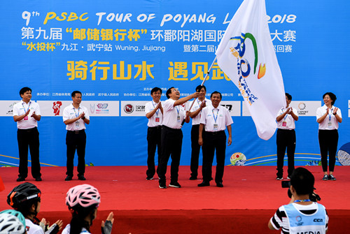 9月16日,第九屆環鄱陽湖國際自行車大賽第五站在風景旖旎的山水武寧舉行。省人民政府辦公廳副主任徐松柏,省體育局副局長林軍,九江市人民政府副市長孫金淼,中國郵政儲蓄銀行九江分行行長鐘暉,武寧縣委書記杜少華,武寧縣委副書記、縣長李廣松,江西水投生態資源開發集團有限公司總經理楊磊,為九江武寧站比賽發令。